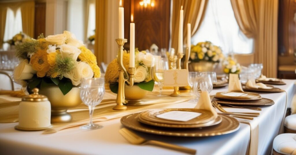 Najpopularniejszym motywem kolorystycznym dekoracji i prezentów na Złote Gody jest złoto. Nie bez powodu – jak już wspomnieliśmy, symbolizuje ono trwałość, wartość i blask. W praktyce oznacza to, że możemy postawić na złote balony, kwiaty, ozdobne wstążki, a nawet złote naczynia czy sztućce. W przypadku prezentów, biżuteria ze złota, złote ramki na zdjęcia z wspólnymi fotografiami, czy eleganckie przedmioty z motywem złota będą idealnym wyborem.